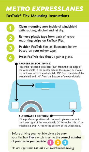 The California Vehicle Code requires all vehicles using the ExpressLanes to have a FasTrak® transponder properly mounted on the windshield. Please be aware that simply having the FasTrak on your dashboard or in your vehicle and not in one of the locations provided with your FasTrak transponder may result in a citation from the California Highway Patrol.